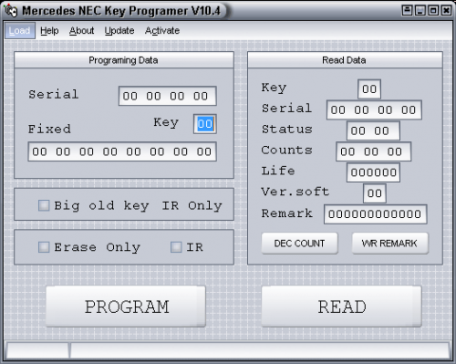 Доступно обновление до версии 10.61 (с опцией "TOOLS" - для чтения информации из новых ключей W212 (предпрограммирование) - 500 EU за обновление с версии 10.60. Инструкция по Mercedes NEC-2 KEY Programmer 10.65 (1,49 MB) |