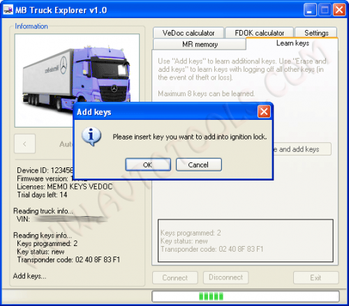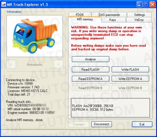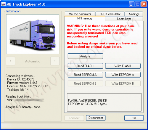 VeDoc калькулятор – используется для генерирования кодов, соответствующих алгоритмам X1 X2 X8 системы авторизации VeDoc. Тип калькуляции X1 - генерирует код для добавления одного ключа в список авторизованных ключей MR. X2 - стирает все ключи из списка авторизованных ключей MR и добавляет ключ в настоящее время находящийся в замке зажигания. X8 - генерирует код доступа для функции MR download в дилерской программе диагностики DAS. FDOK калькулятор – генерирует коды доступа для изменения AdBlue NOx Torque Limit и стирания неисправностей системы выхлопных газов SCR в программе DAS. DAS пароль - выбрав эту вкладку MB Truck eXplorer, можете генерировать пароль для доступа к инженерным функциям, например, для MR изменения с EURO4, EURO5 в EURO3. Лицензии включают в себя: